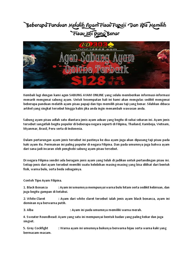 Untuk memenangkan sabung ayam gerakan si ayam haruslah lincah serta memiliki kekuatan dan stamina yang besar. Juga menyediakan 3 pilihan metode deposit yang bisa anda gunakan untuk memudahkan anda bermain judi ayam taji online seperti. Budaya sabung ayam pisau taji cukup terkenal di indonesia. Dinegara filipine sudah melegalkan permainan sabung ayam dengan menyediakan arena resmi dan situs taruhan online seperti situs s128. (pixabay) seorang pejabat tinggi polisi filipina tewas dalam penggerebekan sabung ayam ilegal setelah pisau taji yang diikatkan ke kaki ayam mengenai arteri femoralisnya. Selain menyediakan arena taruhan sabung ayam taji online s128 dan daftar s128, agen s128 app winpalace88. Sama halnya dengan ayam lainnya, ayam peru ini juga memiliki ciri ciri dan kelebihan tersendiri. Nah disini admin sarankan anda memainkan pada situs sv388 di. Sebelum melakukan pemilihan ayam ada baiknya anda menilai dan melihat ayam mana yang cocok untuk bisa ditaruhkan. Pada kesempatan kali ini kami 12naga akan membahas tips memilih sabung ayam juara untuk anda para penggemar taruhan dengan menggunakan uang asli. Ayam peru ayam aduan taji pisau. Ciri khusus dari ayam peru. Ayam tangkas lainnya yang juga digunakan untuk permainan sabung pisau ini adalah ayam peru.